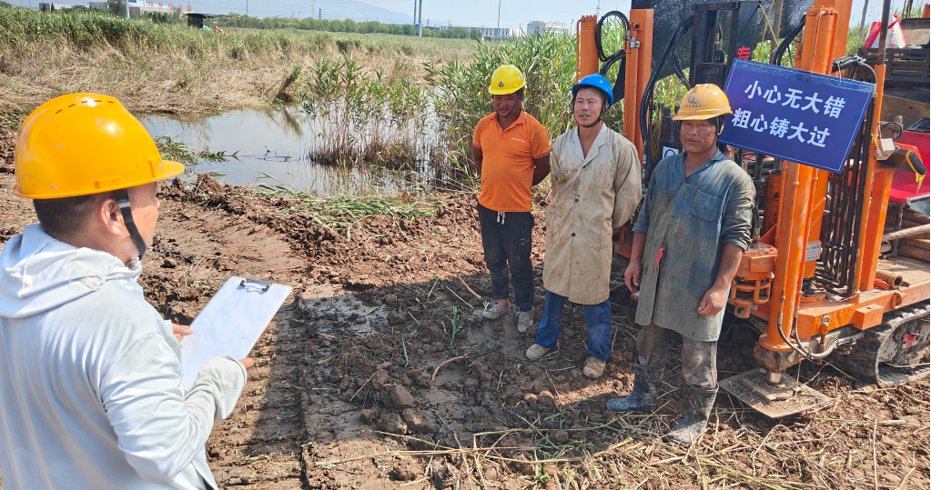 勘察工作的“险”,从首次作业便凸显无遗。重型钻机在塘边陷入泥沼,进退两难;芦苇丛遮挡视线,导致技术员测量的布孔坐标出现偏差,影响勘察精度;40℃的高温炙烤下,部分队员出现中暑前兆;鞋子频繁被尖硬的芦苇茬扎穿; 场地草木芜杂、湿滑难行,蛇虫潜藏出没,凹塘底部淤泥松软,人员作业时随时面临陷入风险,而精准布孔的要求又容不得丝毫马虎。