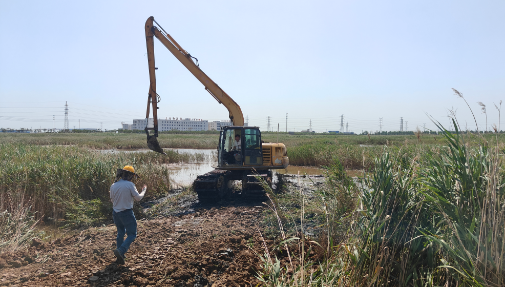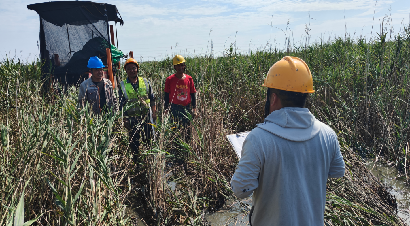 针对芦苇丛形成的天然屏障,突击队打出“机械开路+人工清障”组合拳:调用3台水上挖机对芦苇带进行梳齿式清理,突击队员则手持镰刀,对挖机无法触及的盲区进行精细化处理,累计修筑临时施工便道1.2公里。在铺设便道的狭窄区域,挖机难以作业,突击队员王孟乾系上安全绳率先跳入齐腰深的泥浆中,用身体充当“人肉标尺”,指挥机械操作,最终提前8小时完成通路建设,解决了设备与人员的通行难题。青年党员组成“红色测量队”,在芦苇荡中反复穿梭校准点位,确保每一个钻孔坐标精准无误。